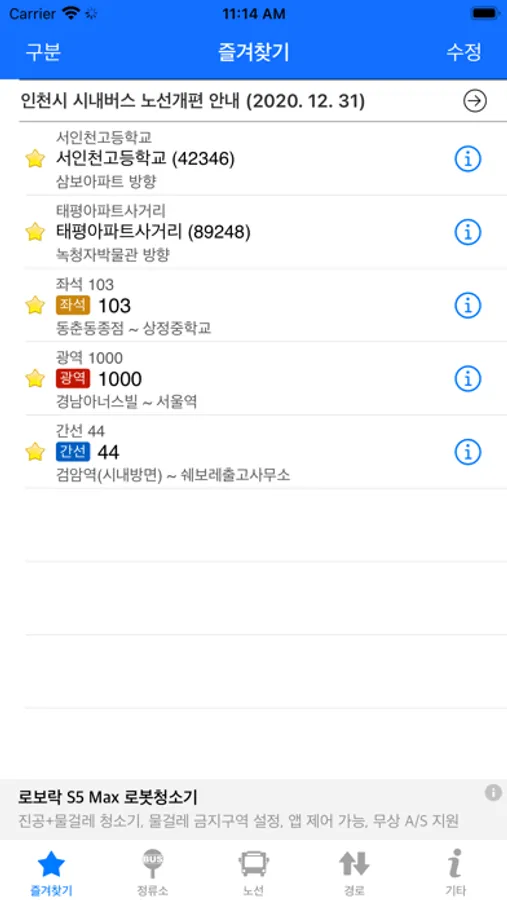 - 자주 이용하는 정류장 및 노선을 즐겨찾기로 등록