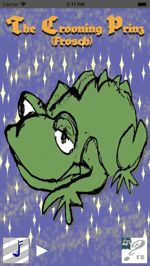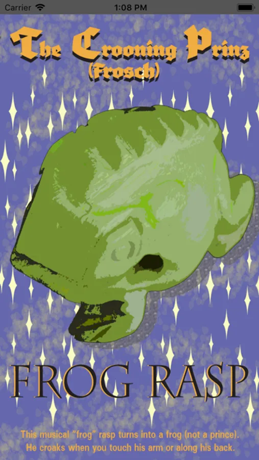 The Crooning Prinz (Frosch) is a "wooden rasp" simulator. When you slide your finger across the Frosch's back (frosch is the German word for "frog") your device will produce a frog like sound. This sound is the tones of the wooden rasp precision instrument. You can play along with your favorite music or just annoy your friends. The Crooning Prinz (Frosch) also has a "Music" and "Play / Pause" buttons. First introduced in the new version of Big Daddy'O Bongos (bdBongos), which is also available on iTunes, there is the "Music" and "Play / Pause" buttons. You can pick a song from your device's playlist from within the app. Simply tapping the "Music" button will give you a list of the songs on your device. Pick one or more song and press the "Done" button. You will then return to The Crooning Prinz (Frosch) were the music is ready to be play by tapping the "Play / Pause" button.