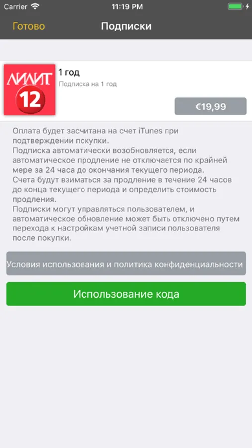 * Оплата будет засчитана на счет iTunes при подтверждении покупки. Подписка автоматически возобновляется, если автоматическое продление не отключается по крайней мере за 24 часа до окончания текущего периода. Счета будут взиматься за продление в течение 24 часов до конца текущего периода и определить стоимость продления. Подписки могут управляться пользователем, и автоматическое обновление может быть отключено путем перехода к настройкам учетной записи пользователя после покупки.