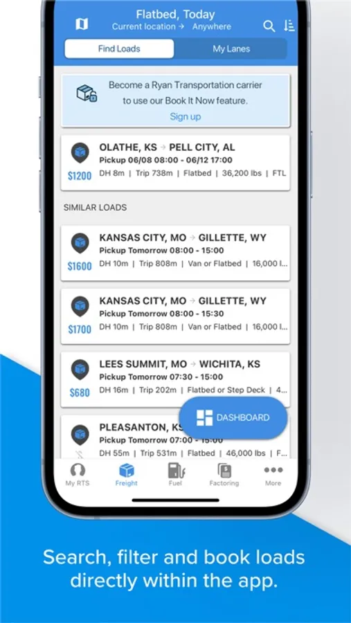 • Browse, search and book from thousands of available loads in our exclusive load board