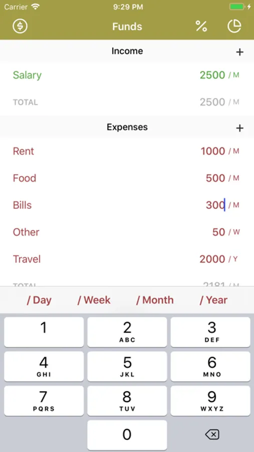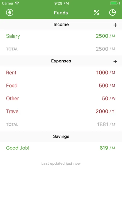 Creating a budget should be easy and fun. Funds helps you create a budget by simplifying the process and eliminating complicated steps. Simply add your income and expenses including the amount and frequency (daily, weekly, monthly, yearly) for each item and Funds will calculate and visualize how much you're spending and saving. The color scheme will also change based on how much you're saving to give you a quick impression of your savings throughout the app.