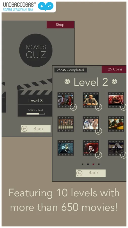 Featuring more than 650 movies to guess divided in 10 levels of ascending difficulty: from the most popular cinema classic to the most obscure title only true cinephiles will be able to identify!