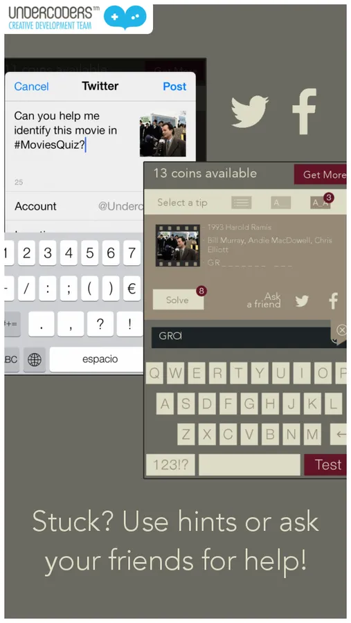 Stuck in a movie you can't name? Use the coins to get valuable hints or ask your friends to aid you via Twitter or Facebook.