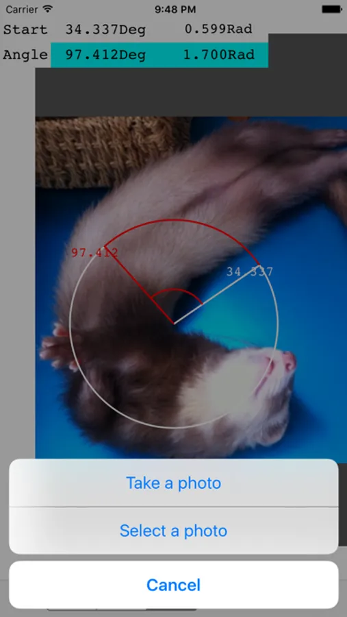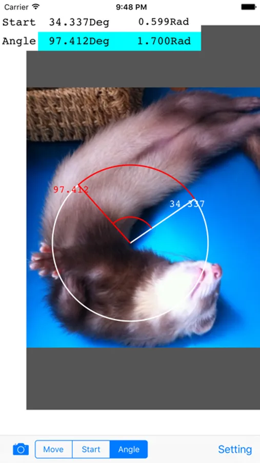 分度器アプリです。【使い方】写真を撮ります。移動ボタンを押して、写真の測定部分を測定円の中心にスライドスライド。角度ボタン、始線ボタンで測定線をクルクル移動すれば角度とラジアンが表示されます。簡単でしょ。(^^)/