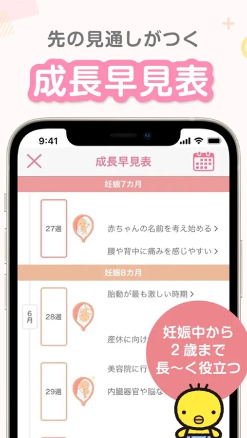 妊娠中は、出産予定日はもちろん、カレンダー機能で、何月頃に妊娠何カ月になっているかが分かりやすく、出産に向けた準備などに便利です!