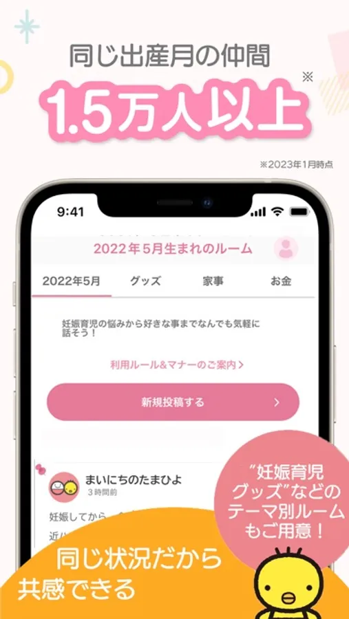 ”あなたと同じ出産予定月”の人が約1.5万人以上(※)集まる「ルーム」をご用意。