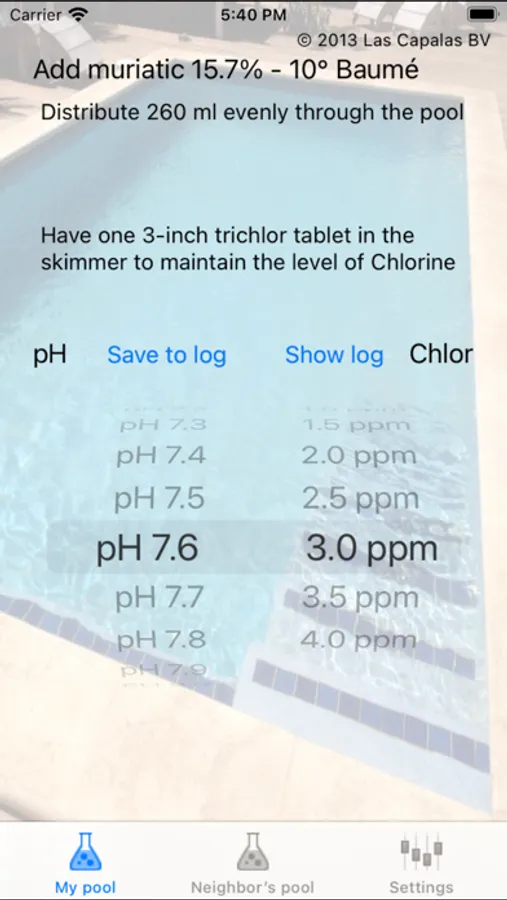 - Measure chlorine and pH every other day (less than 5 minutes). This measurement is really the key to a healthy pool. Algae don't get a chance in your pool if you maintain a proper level of Chlorine. For Chlorine to work optimally, the pH value needs to be in the right range. This app helps you do those two things.