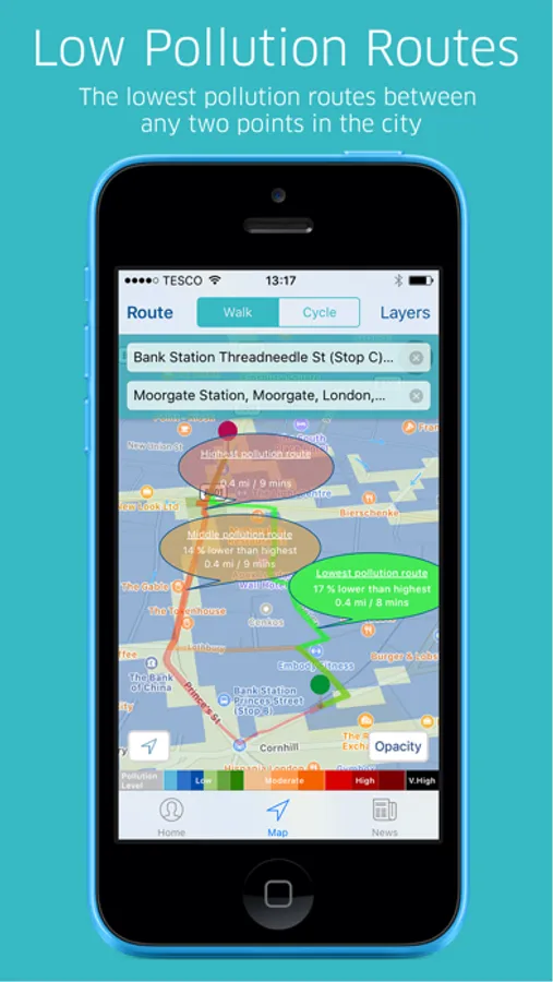 Use the map to plan your journey and easily pick the lowest pollution route through the City - even in 3D!