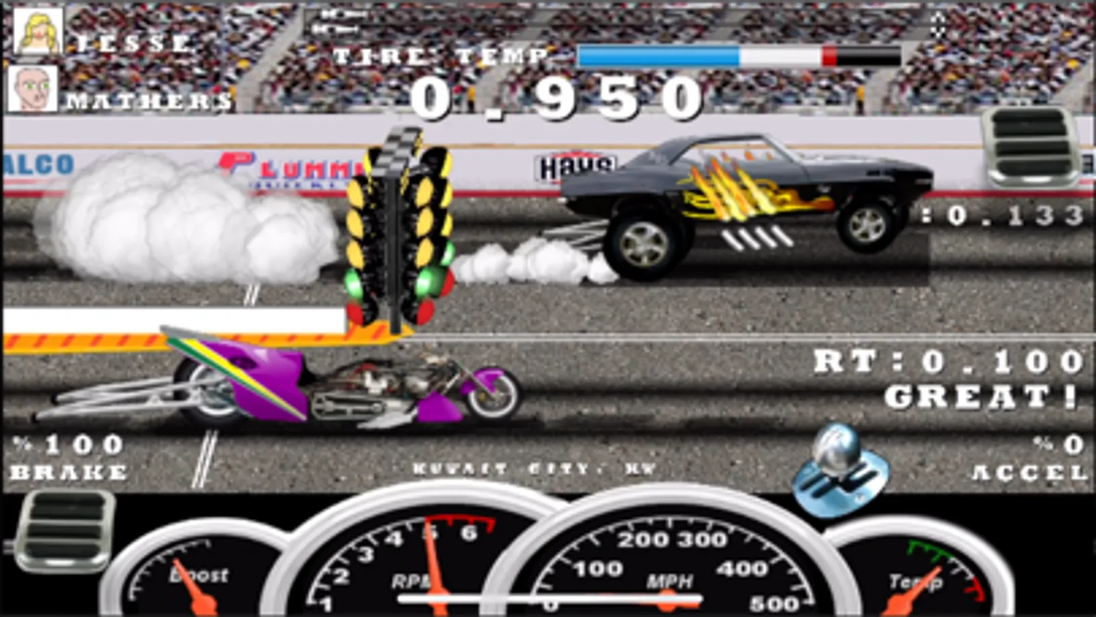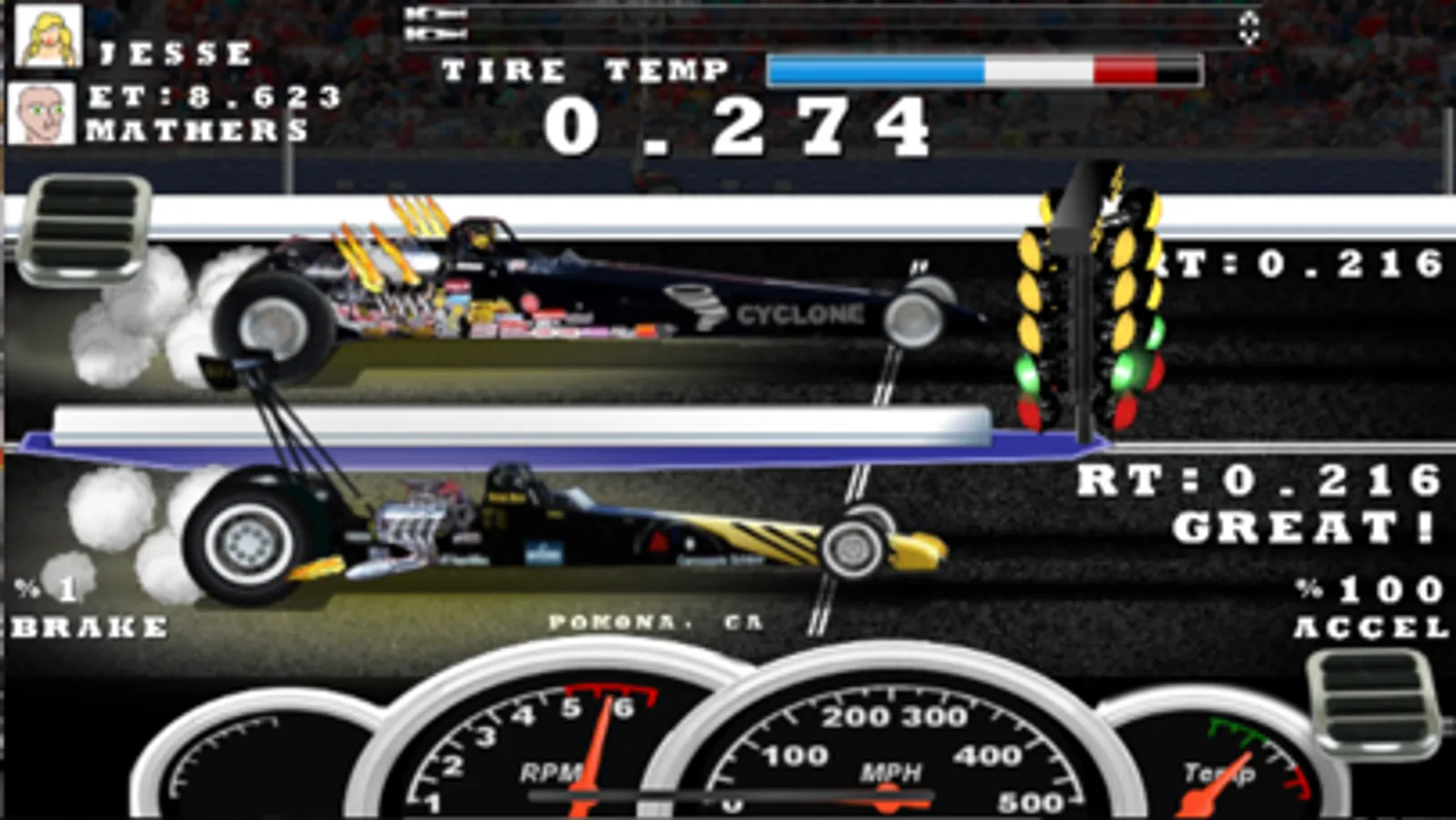 Get the best time in heads up drag racing action to move on in the bracket tournament.