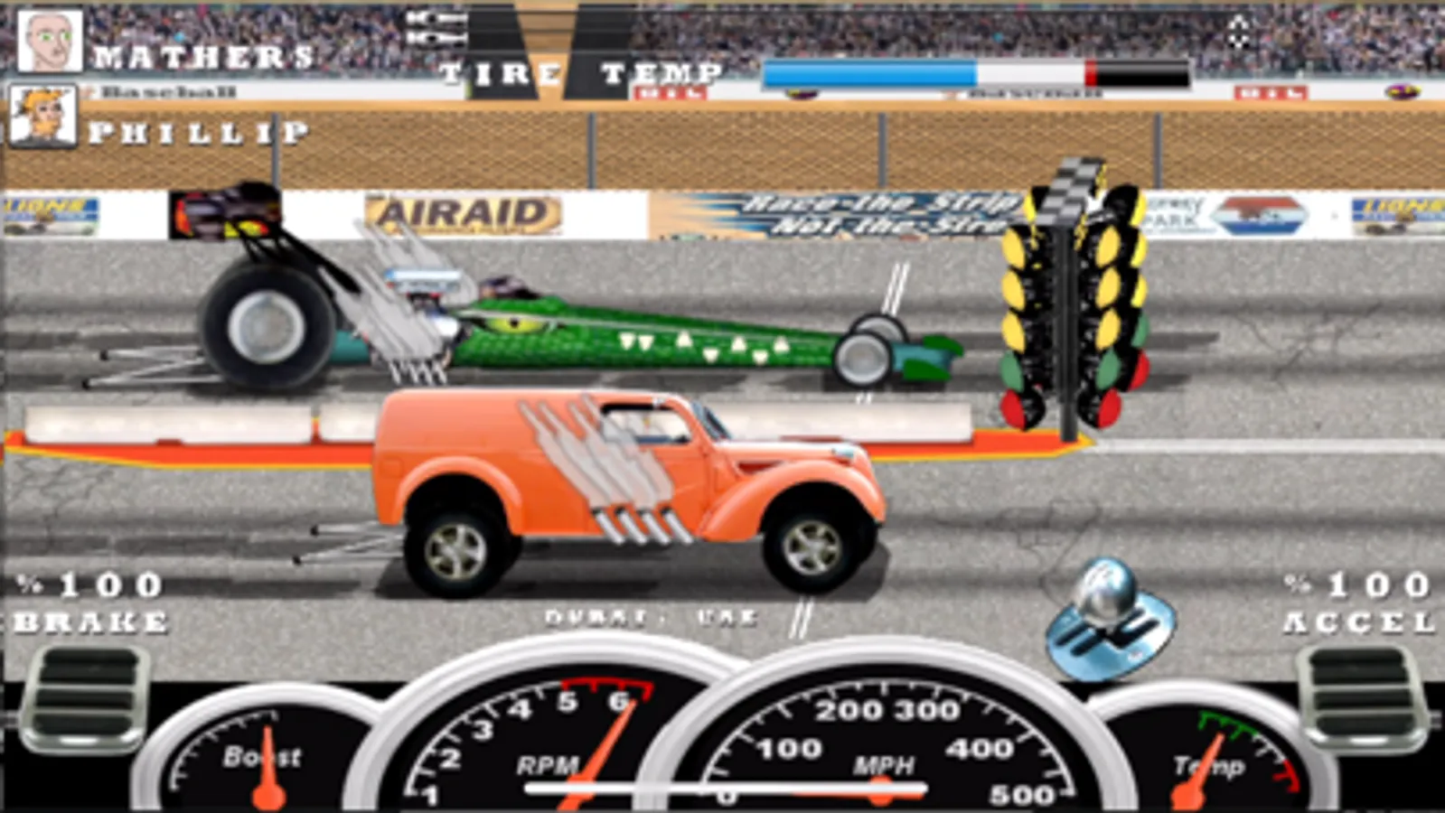 Use a combination of gas and trim to keeps your dragster ahead without destroying your ride.
