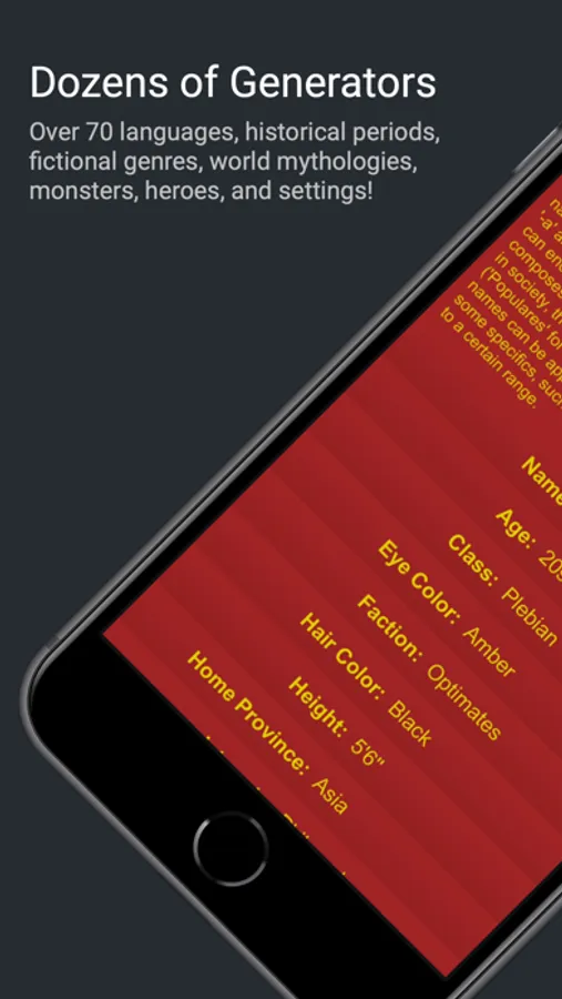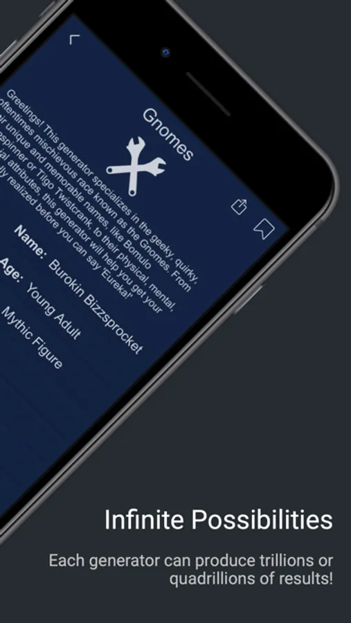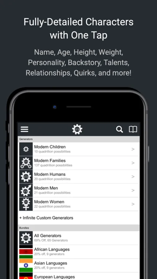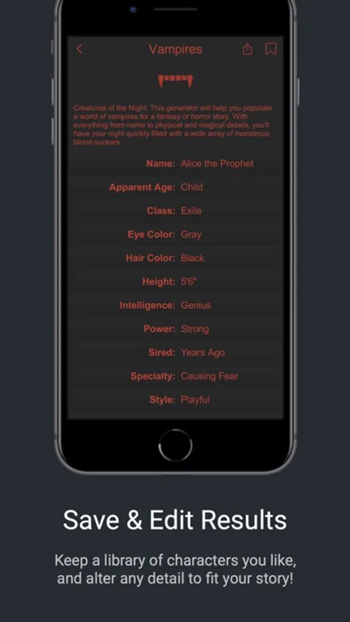 Pulling from an extensive database of names and vital statistics, Characterize can generate literally quadrillions of new characters! That's more than enough for even the most ambitious of projects, and plenty to help you find the perfect avatar for your next story. You can even choose between fantasy, pirates, modern names, and more to give your character the authentic details that matter. Save your favorites, and bring up a whole new character with a quick tap!