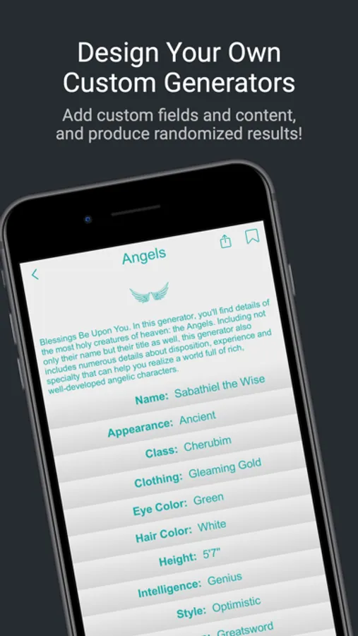 - Save your creation for reference with a few quick taps, or share with friends! Then, view your saved characters anytime from the selector. Whether you're finally naming that long-discussed protagonist, populating a gaming world or even challenging yourself to write a story without knowing who the players will be beforehand, Characterize makes it easy to create realistic, fully realized characters at the touch of a button.