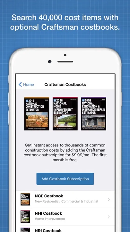 The first 30 days are free. The ContractorTools subscription is $49.99 per month. You can also subscribe to the Craftsman costbooks within the app for an additional $9.99 per month.