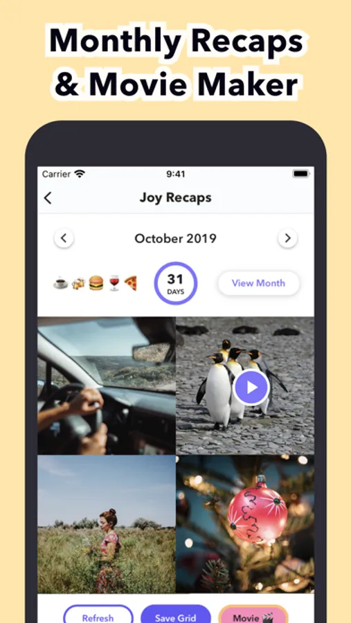 After one week, you can hop back to memories in your gratitude journal from exactly a week ago. This period grows to months and even years. After two weeks, you can view random moments using the Happiness Jar. Each month, create a recap video of your favorite photos and clips.