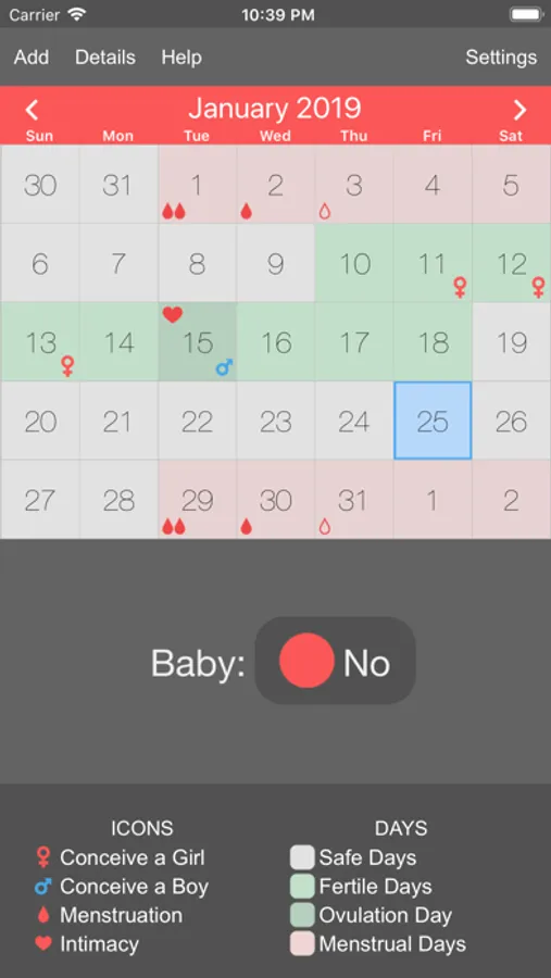 The application is based on the scientific research. It helps to determine the fertile days of the month, so you can either achieve or avoid pregnancy. The application uses the date of the last period and shows the date of the next period, the best days to conceive a baby, the ovulation day and when you can avoid pregnancy.