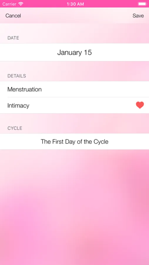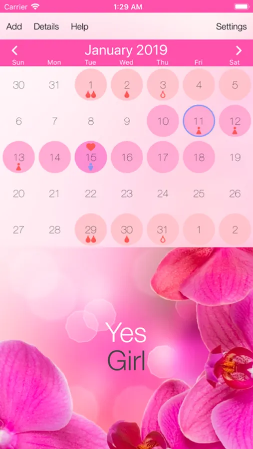 - Average length of the menstrual cycle (adjust it on the “Settings” screen).