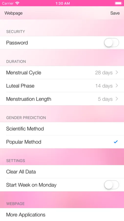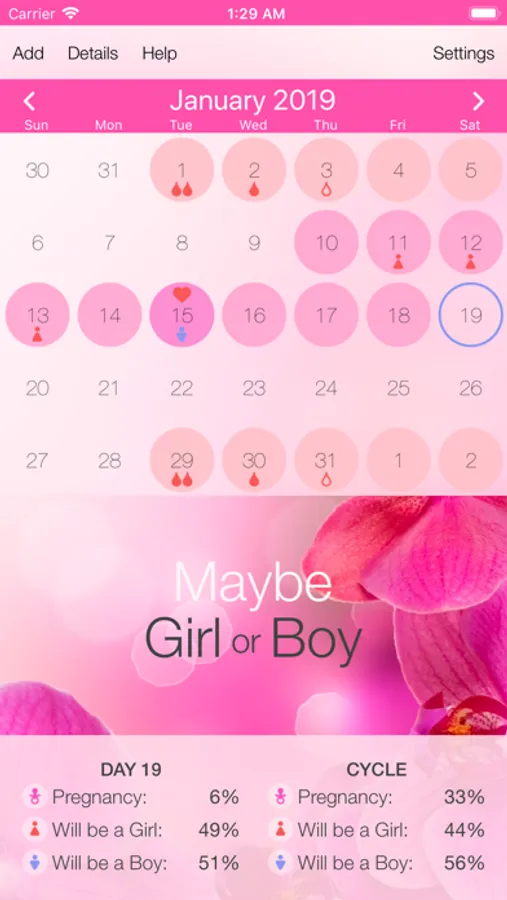 You can change the gender prediction method on the “Settings” screen. But remember that either gender prediction method shows only slightly higher chances of conceiving a girl or a boy and it never guarantees the result.