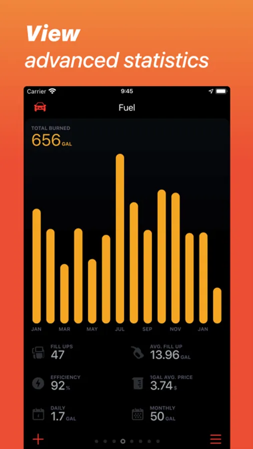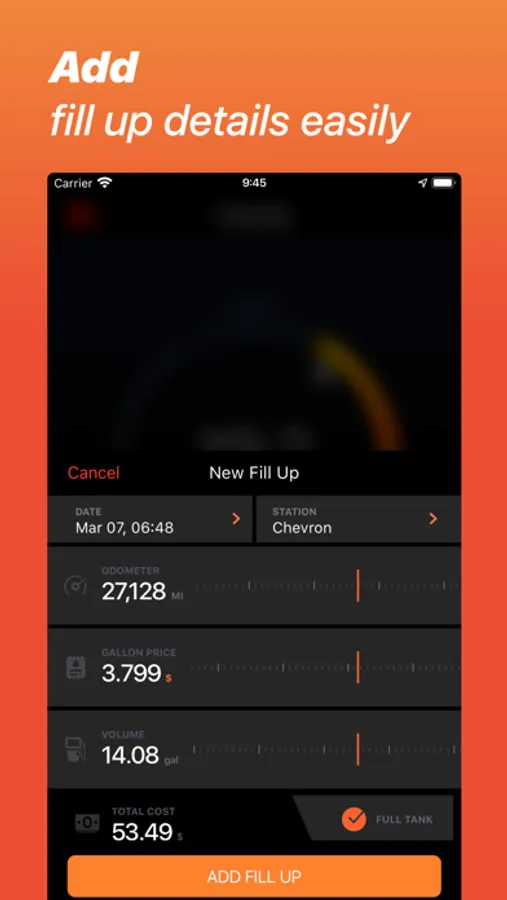 Enter fill-up details with just a few taps only. Jerrycan has intuitive sliders for entering data instead of typing lots of numbers.