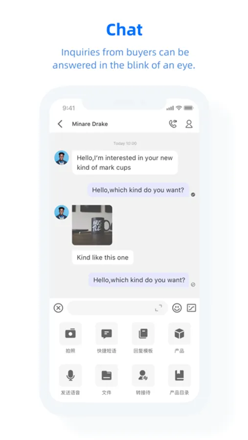 [Chat] Inquiries from buyers can be answered in the blink of an eye. Alibaba Supplier supports a computer and mobile device being logged into the same account at the same time so that no transactions will be missed. There are also several ways to chat such as voice and video chat, and you can also check the read/unread status of messages and quickly understand what the buyer wants.
