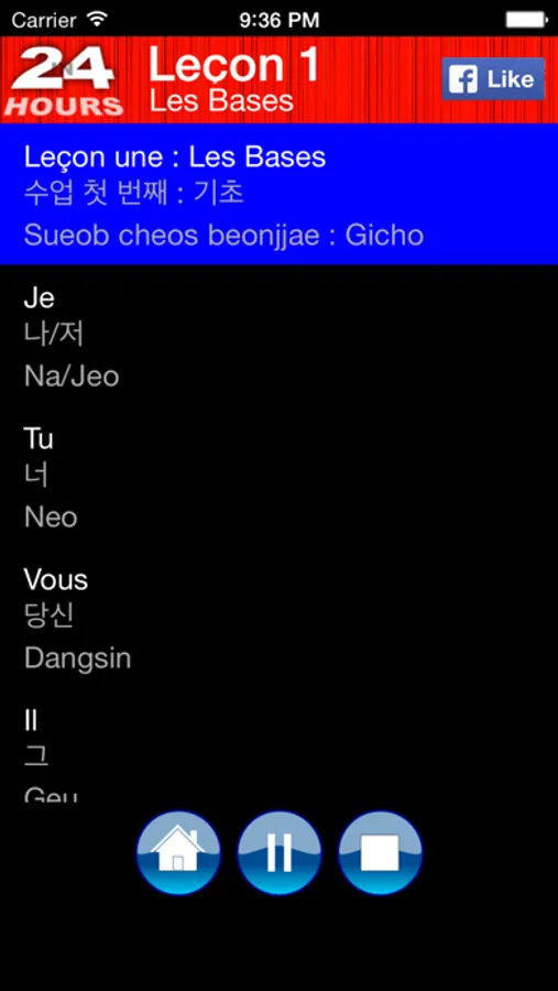 Trop occupé pour s’inscrire à un cours de langue Coréen ou est-ce peut-être trop cher? Vous n’êtes pas seul et nous avons une solution. Cette application est conçue pour fonctionner avec votre style de vie! Grâce à la fonctionnalité audio de l’application, vous pouvez toujours apprendre lors de vos déplacements. Que ce soit en voiture, dans le bus, en train, durant un jogging dans un parc ou peut-être en vous relaxant dans votre lit, il suffit de brancher vos écouteurs et commencer à apprendre! Cette application vous propose le moyen le plus simple et le moins contraignant d’apprendre la langue Coréen!