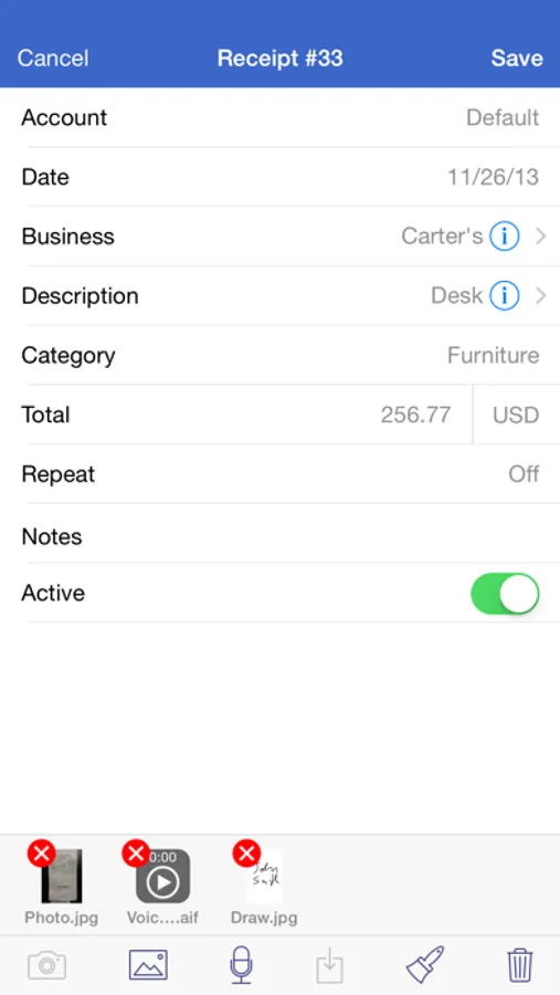 - attach photos, drawings, voice memos, and other files to receipts