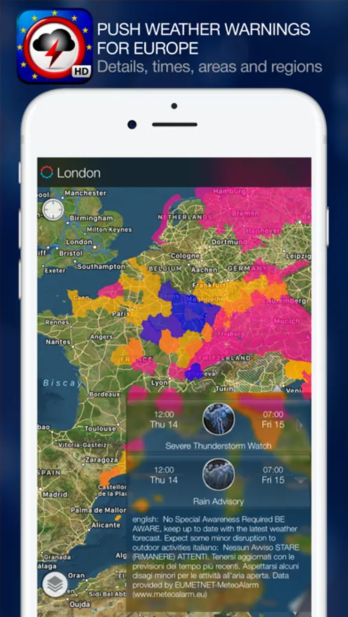 Weather Alerts Europe is the only app you need for the latest weather information. Get critical severe weather alerts for your location in easy and intuitive way - using PUSH notifications and weather maps. App offers Satellite images of national and local cloud cover, Current weather and Ten-day weather forecast, Sea surface temperature, Earthquakes as a premium feature. Stay ahead of severe weather wherever you are with the Weather Alerts Europe application !