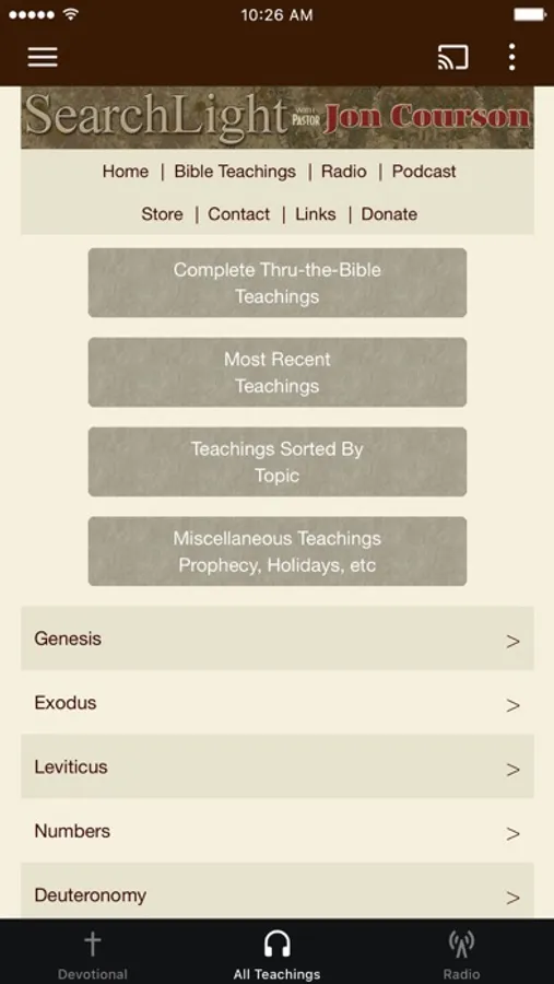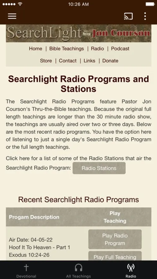 With this app, you can read Pastor Jon Courson’s daily devotional, get video or audio of any of his Thru-the-Bible teachings or listen to the daily Searchlight radio program.