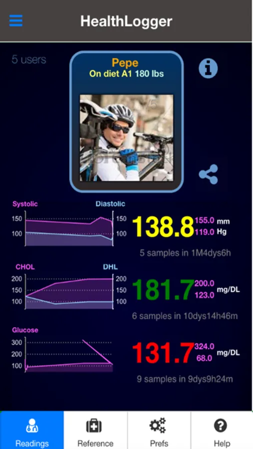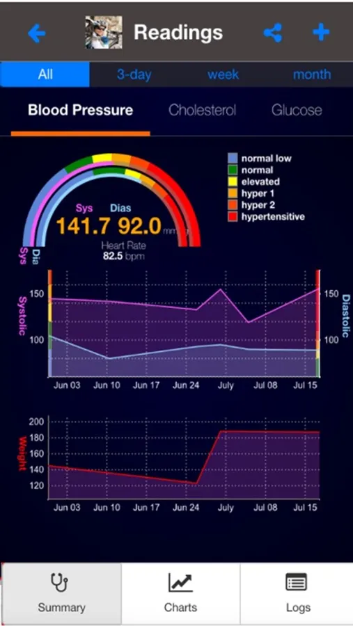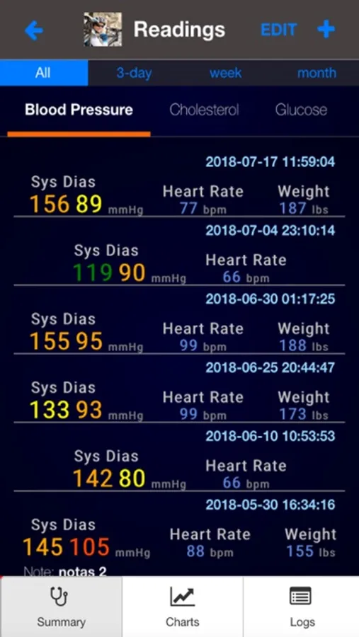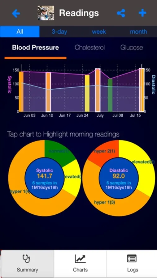 - Log Blood Pressure, Cholesterol and Glucose levels in one place.