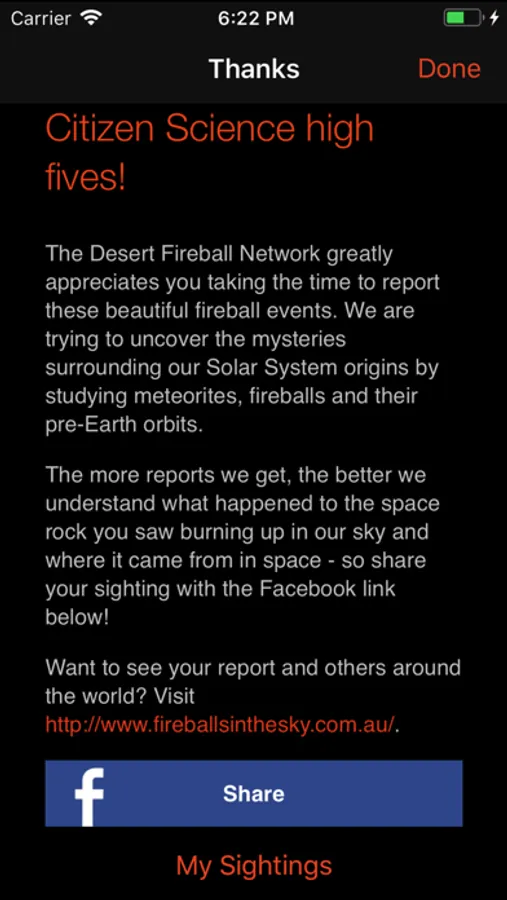 • Get updates on your sightings, and see levels of detail in feedback: Was it seen by other users? If it was, then how many other users saw it? Was there enough information to work out a trajectory? What was its orbit: where did it come from in the solar system?