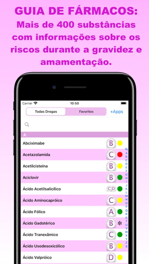 - GUIA DE FÁRMACOS - mais de 400 substâncias com informações completas e confiáveis em relação aos riscos durante a gravidez e amamentação. Cada medicamento possui classificação de segurança em relação a gravidez (Pela Classificação do FDA; Categorias A, B, C, D, X) e lactação (Pela Classificação do Min. da Saúde - Brasil; Compatível, Criterioso ou Contra-indicado).Tudo bem acessível, com informações na tela inicial, barra de buscas e índice e espaço para você incluir suas anotações...