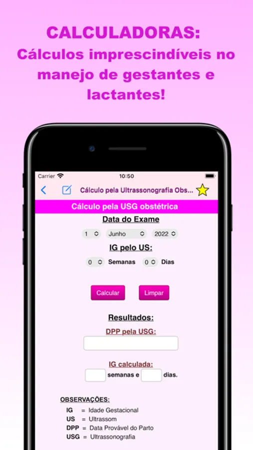 - CALCULADORAS - cálculos imprescindíveis como USG Obstétrica (data provável do parto e idade gestacional), datas importantes da gravidez pela última menstruação (data provável do parto, data final dos trimestres, idade fetal...), discordância de peso entre gemelares, estimativa de risco para prenhez ectópica, evolução de peso gestacional, índice de Bishop, probabilidade de parto pré-termo, probabilidade de cesariana...