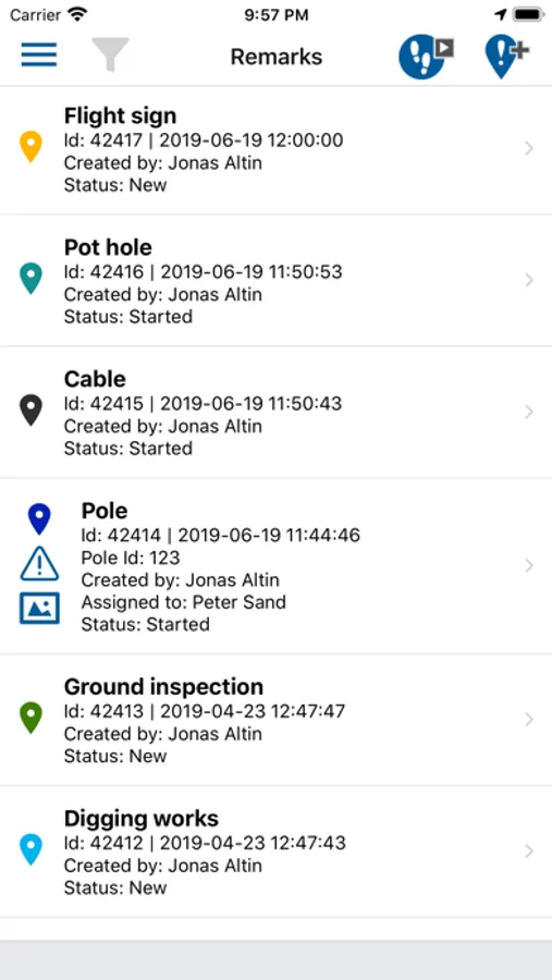 The app automatically logs the GPS coordinates for remarks so that you have exact position and can find the location again when it's time to correct the problem. It's also possible to place remarks wherever you want on the map by pointing at the location on the map.