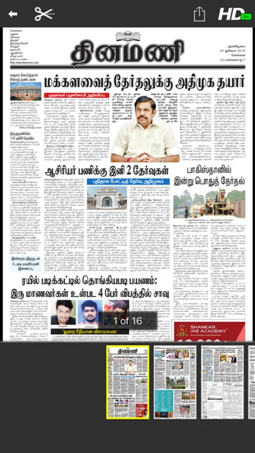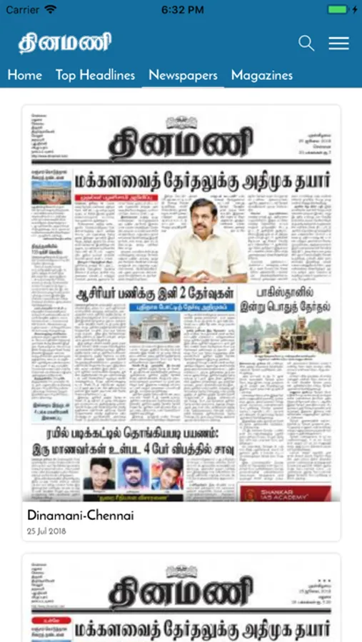 Dinamani is daily newspaper printed and published from Chennai, Coimbatore, Vellore, Trichy, Madurai, Tirunelveli, Dharmapuri, Bangalore, and New Delhi in India. The newspaper was established in 1933 and owned by The New Indian Express Group. The first edition came in 1934 September 11. Dinamani is a fully developed newspaper with well separated news, editorial and feature sections.