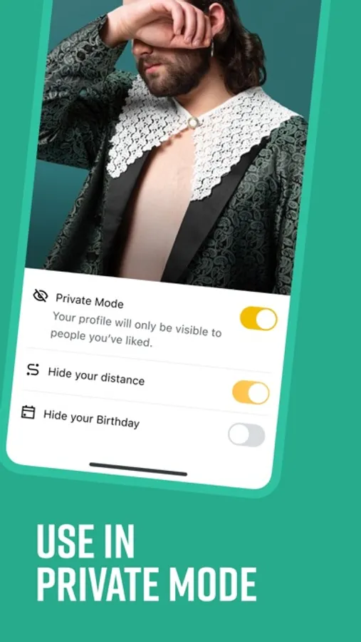 • Private Mode – be visible only to the men you like or match with.