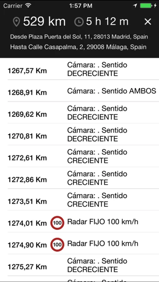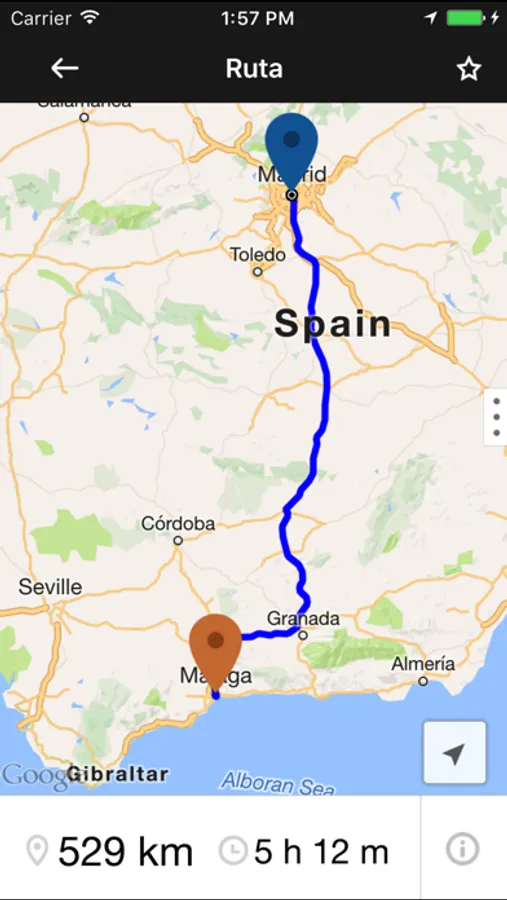 Mapa: dibuja la ruta en el mapa, pudiéndose utilizar el zoom en caso de distancias largas. Se mostrará la distancia y tiempo estimado de llegada según velocidades permitidas de los tipos de vía que intervengan en la ruta y para vehículo de tipo automóvil.