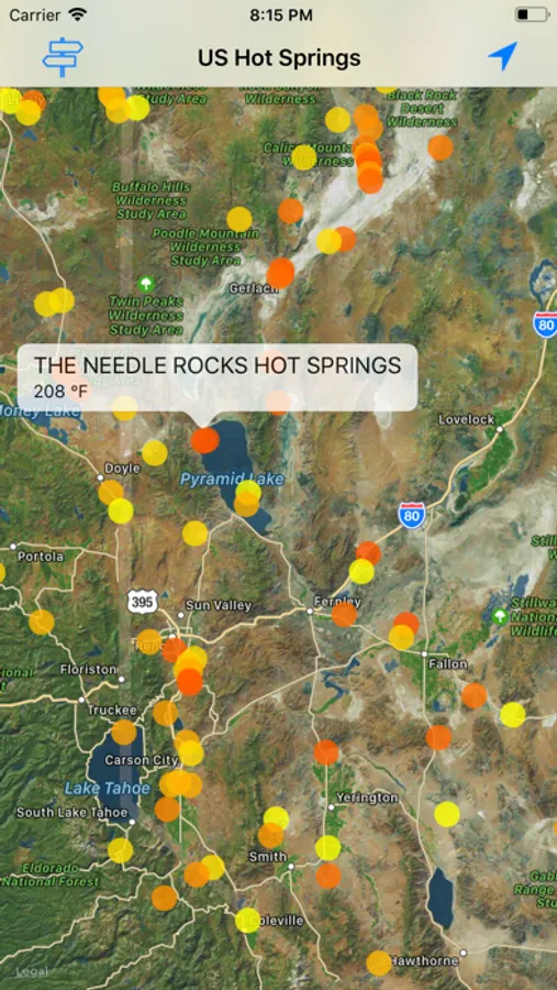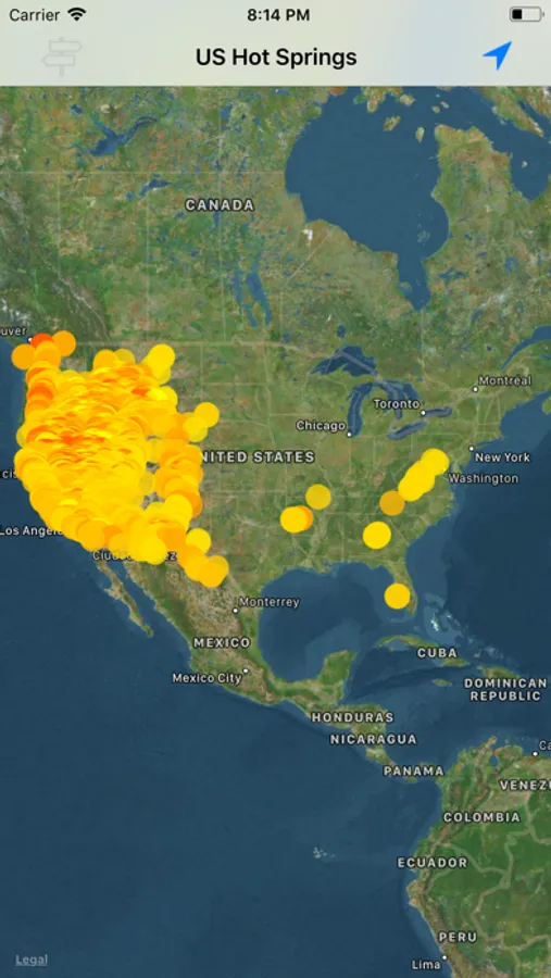 Find any local hot spring! Every hot spring in the United States is shown including its temperature!