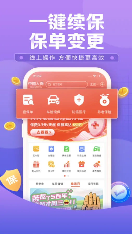 保险商城:产品种类涵盖车险、意外险、旅游险、家财险、责任险、医疗险、重疾险等,支持线上自助投保。