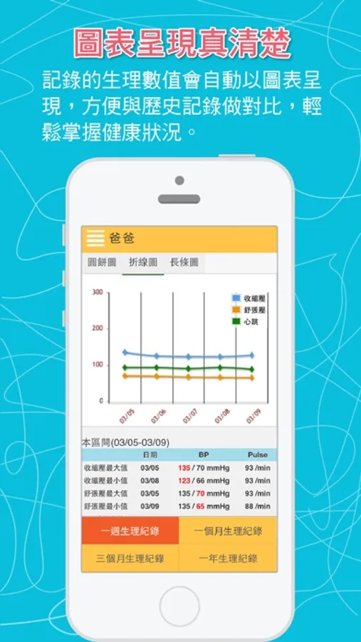 -透過分析工具自動將您的生理數值區間分類,簡易圖表更容易查看與比對紀錄。