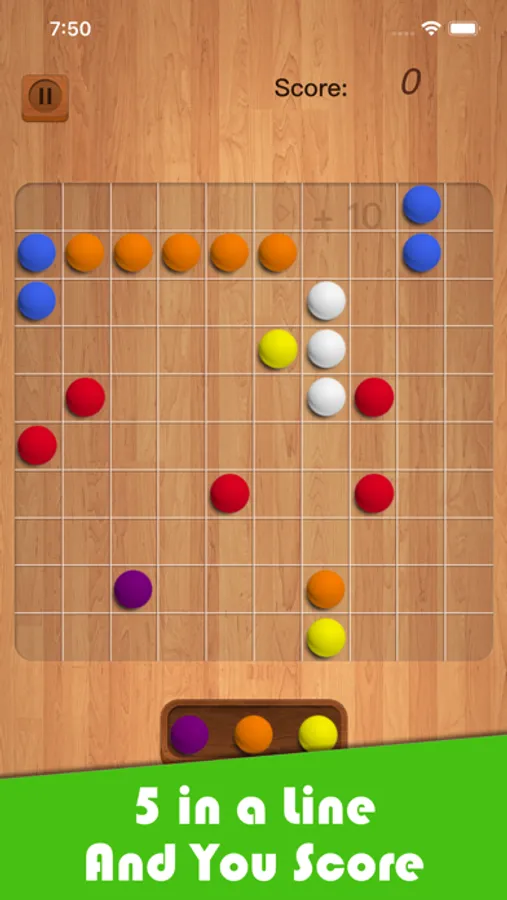The goal is to earn points by removing lines of at least five same-colored balls on the 10x10 board.