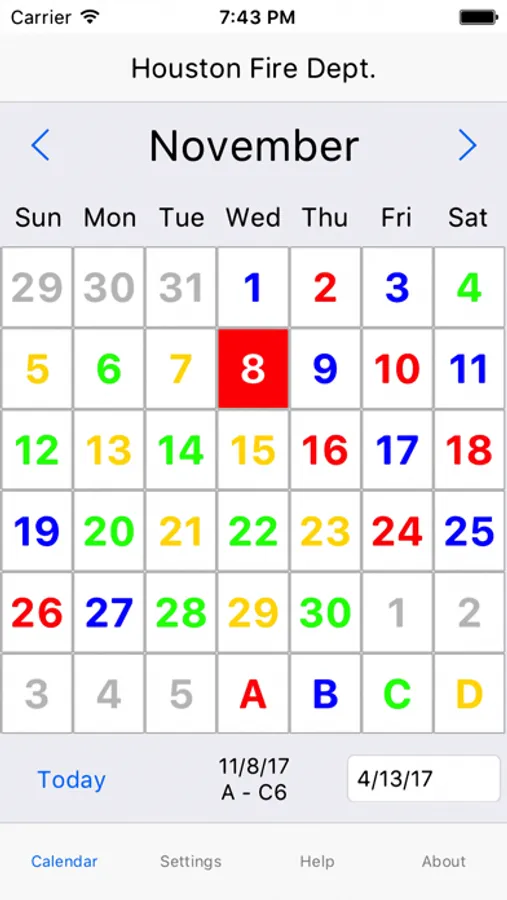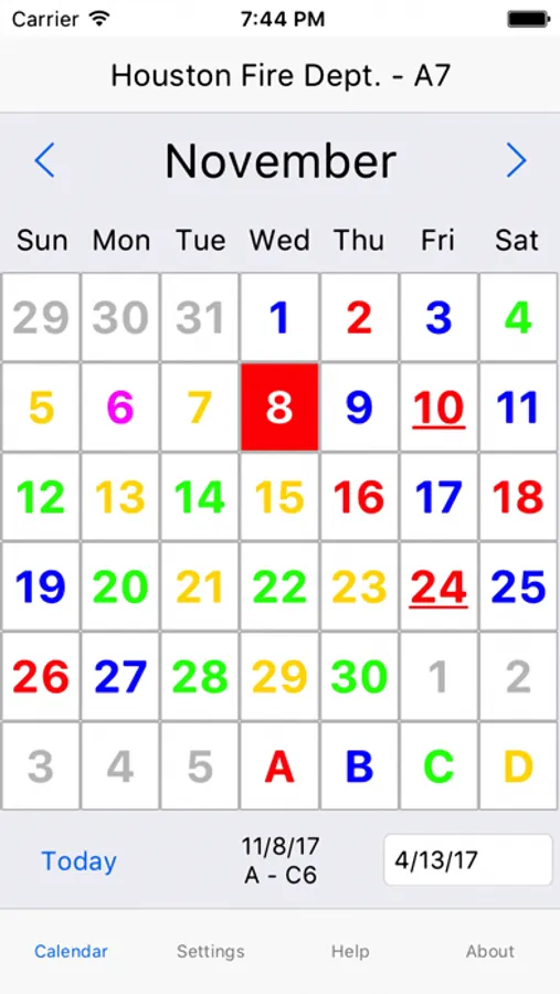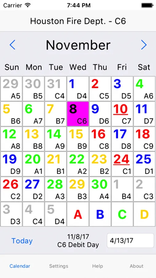 ShiftCal® for Houston Fire Department is a shift calendar with full support for debit days, which are displayed in an alternate color. ShiftCal also optionally displays paydays.