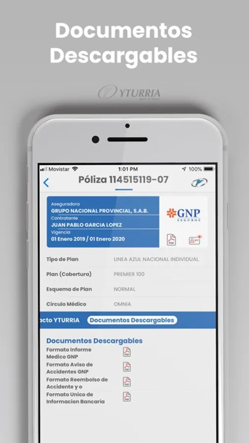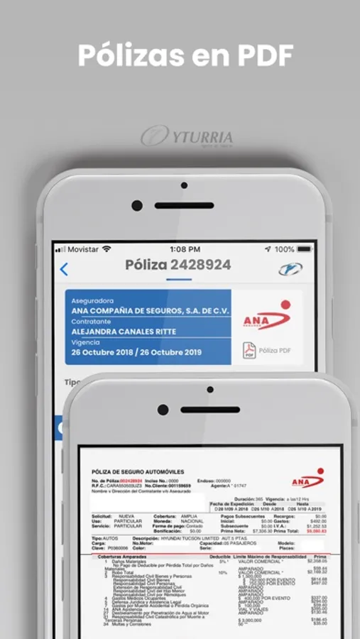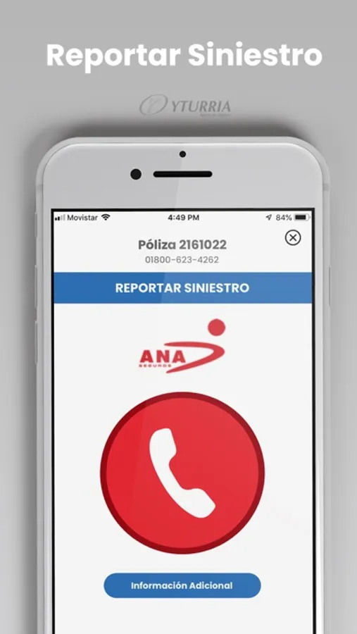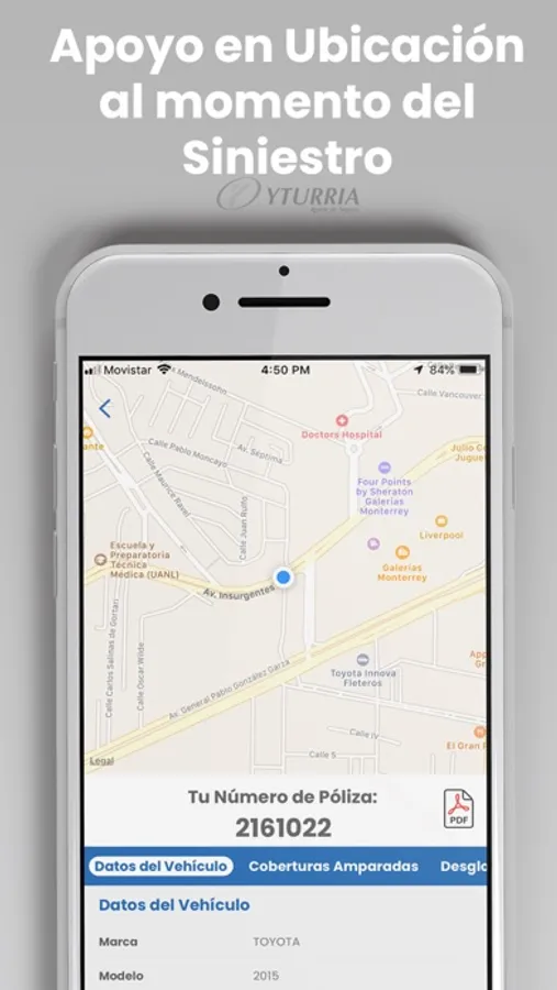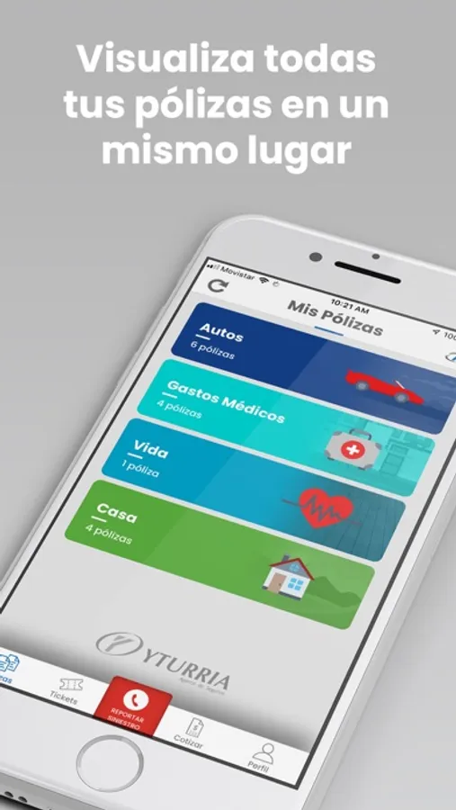 YTURRIA Seguros es una aplicación gratuita propiedad de YTURRIA Agente de Seguros, S.A. de C.V., que le permitirá consultar sus pólizas sin la necesidad de capturarlas manualmente, así como también reportar algún siniestro con tan solo oprimir un botón. La aplicación lo contactará directamente con la Compañía Aseguradora con quien tenga contratada su póliza.