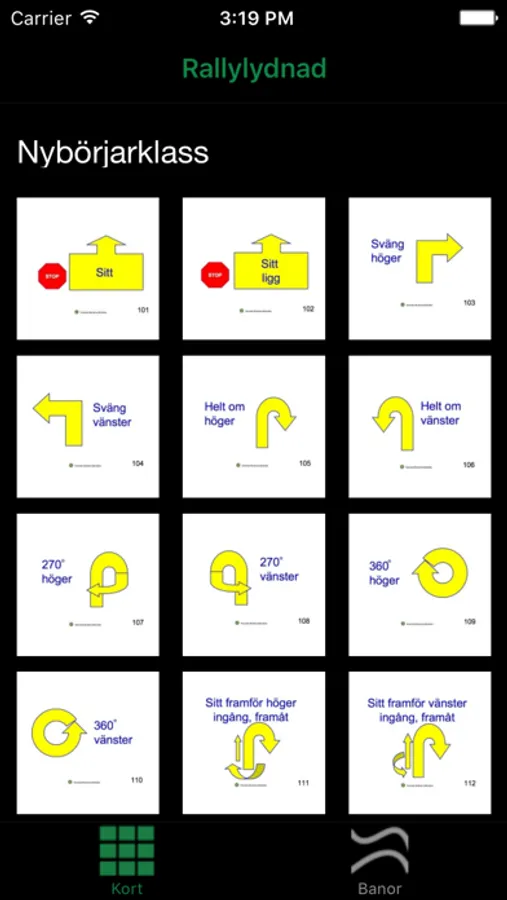 En referensapp för Rallylydnad med alla kort från nybörjare till mästerklass.