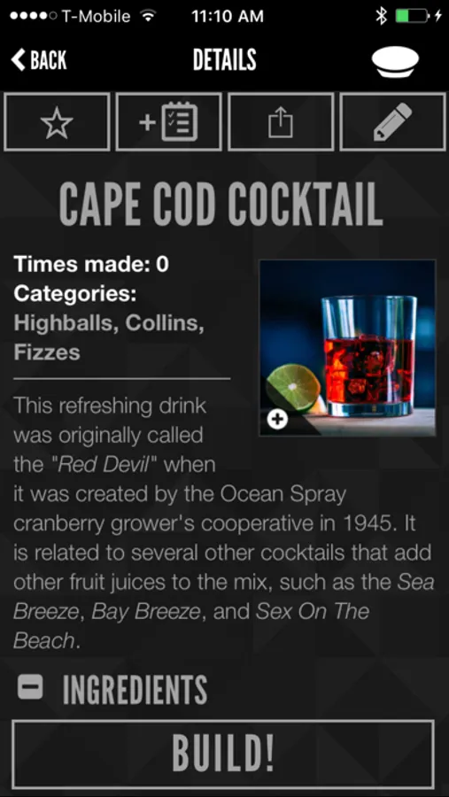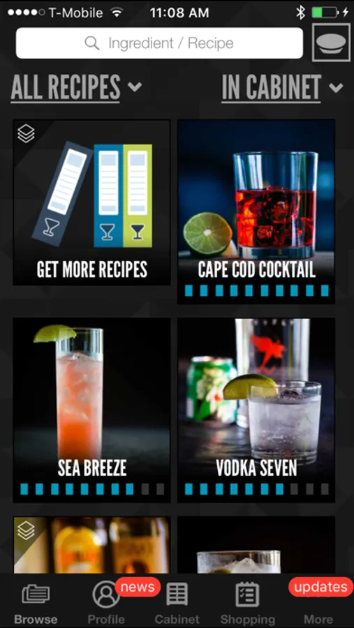 • The Cabinet feature allows you to select the ingredients you have on hand and sorts the cocktails in order, from highest percentage match to lowest.