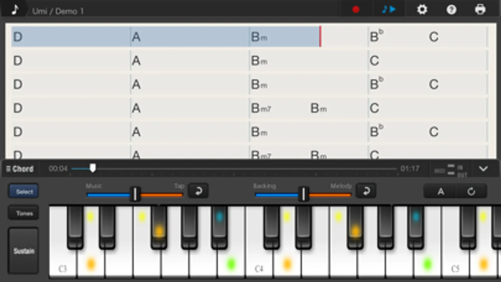 Audio files in your iPad or iPhone are analyzed by the original Casio Chordana technology, and the sounds played in each song are displayed on the screen as chord chart. At the same time, the chord positions for the instrument are displayed as the song plays.