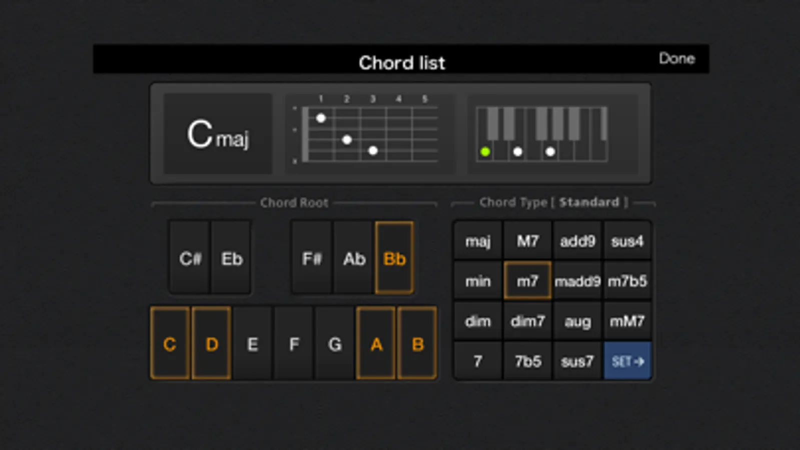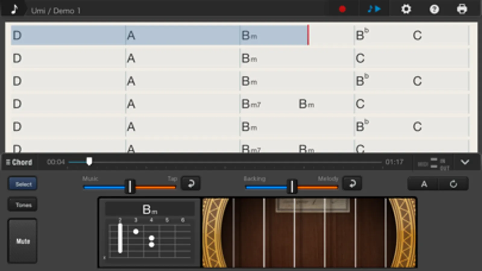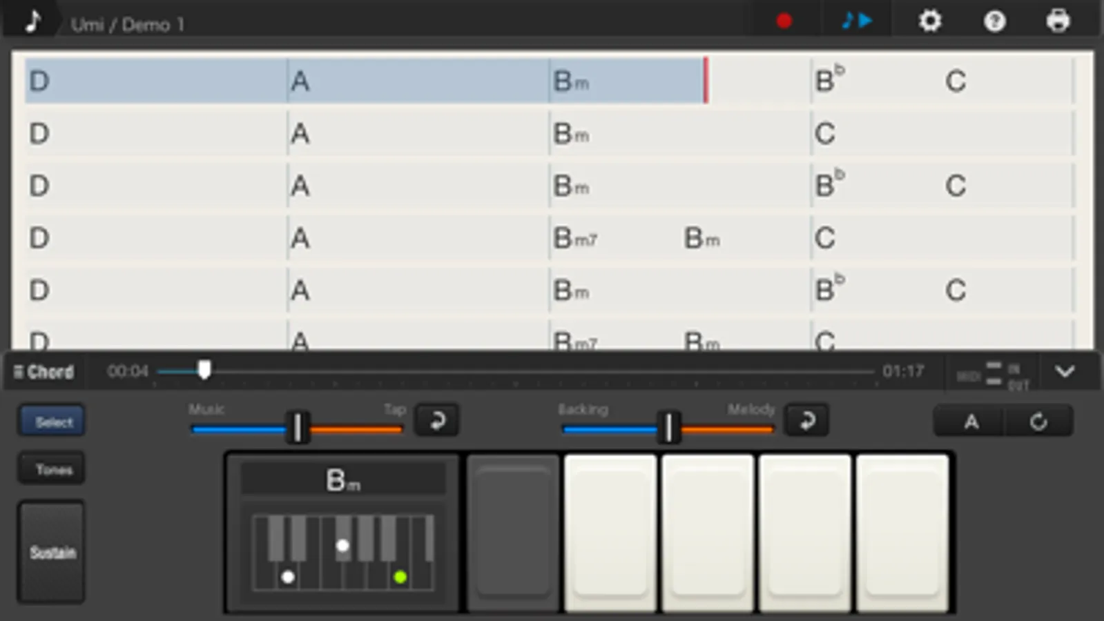 By touching a chord in the chord display pane, you can check the chord position for the instrument selected in the Performance pane.