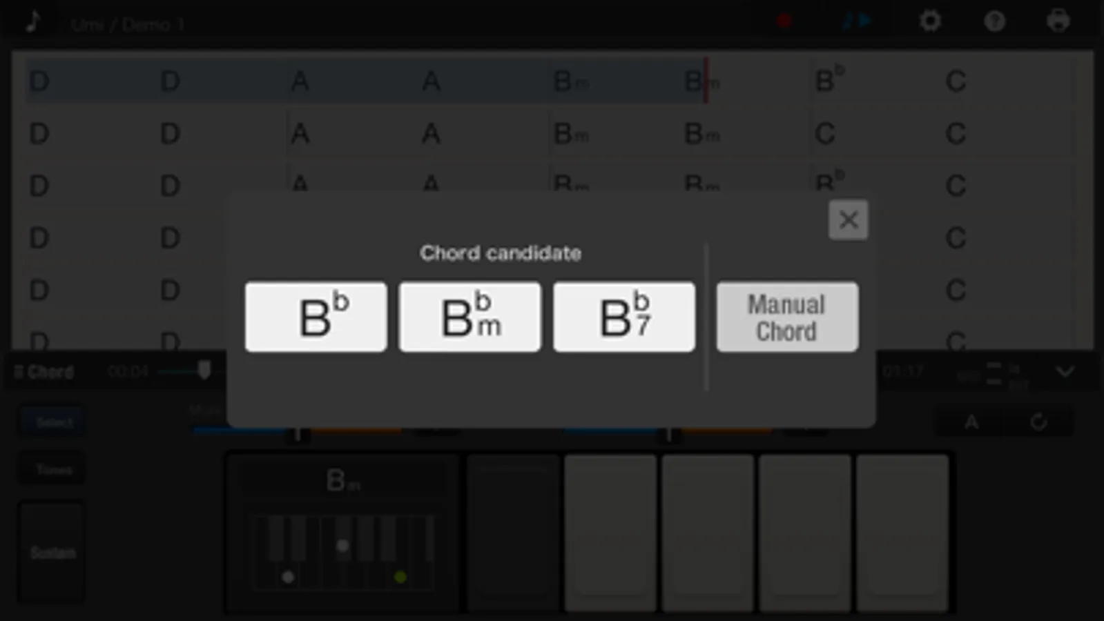 You can modify the chord chart by choosing a chord from up to three candidate chords that are closest in sound to the analyzed chord. You can also specify the chord manually. You can also adjust barline position.