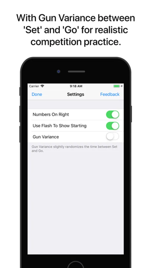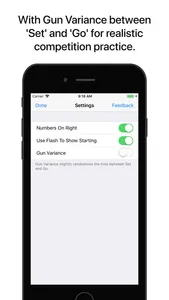 Under “Settings” you can also enable “Gun Variance”. This will vary the time between “Set” and the pistol fire. The variance will help you practice for races when starters are inconsistent at competitions.