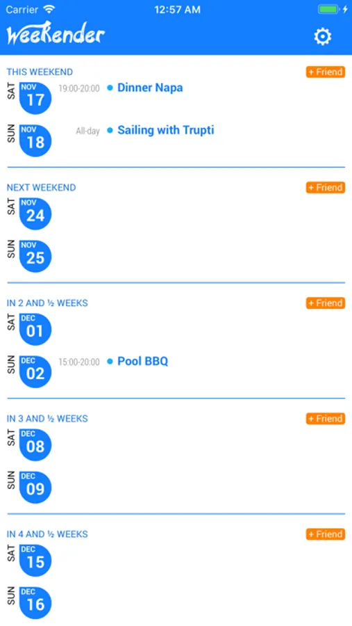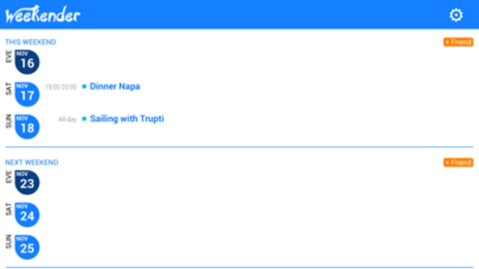 Weekender is a calendar app that shows your upcoming weekends at a glance. Easily spot empty weekends early on so you can plan trips or events with friends and family, and make the most of your weekends :)
