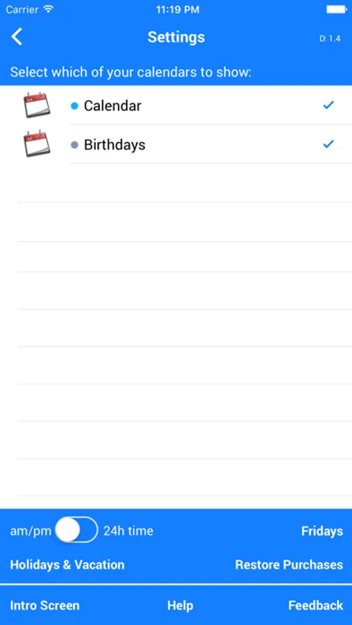 * In-app purchase to define your own Holidays and Vacation days that are shown along your weekends