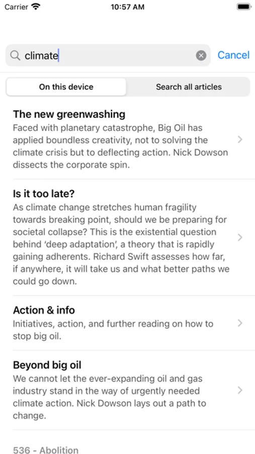 Search the complete archive, even when you’re offline. Type the words or parts of words you'd like to search, and articles appear as you type to match your search terms.